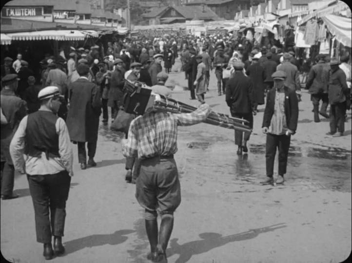 A montagem do filme também é muito boa, como já citei aqui algumas vezes. Ela tenta acompanhar o próprio ritmo da cidade: no início, quando os trabalhadores ainda estão acordando, os planos são mais longos, havendo menos cortes. Quando o trabalho começa para valer, a câmera se desloca para o ambiente de fábrica, a montagem fica rápida e frenética, alternando entre planos de vários trabalhadores em seus diferentes ofícios. Quando as máquinas são desligadas, os planos novamente ficam mais longos, acompanhando os trabalhadores em seus momentos de lazer. No final do filme, a câmera se volta para o movimento da cidade, focando nos bondes, nas pessoas nas ruas, e os planos ficam mais curtos e acelerados novamente.